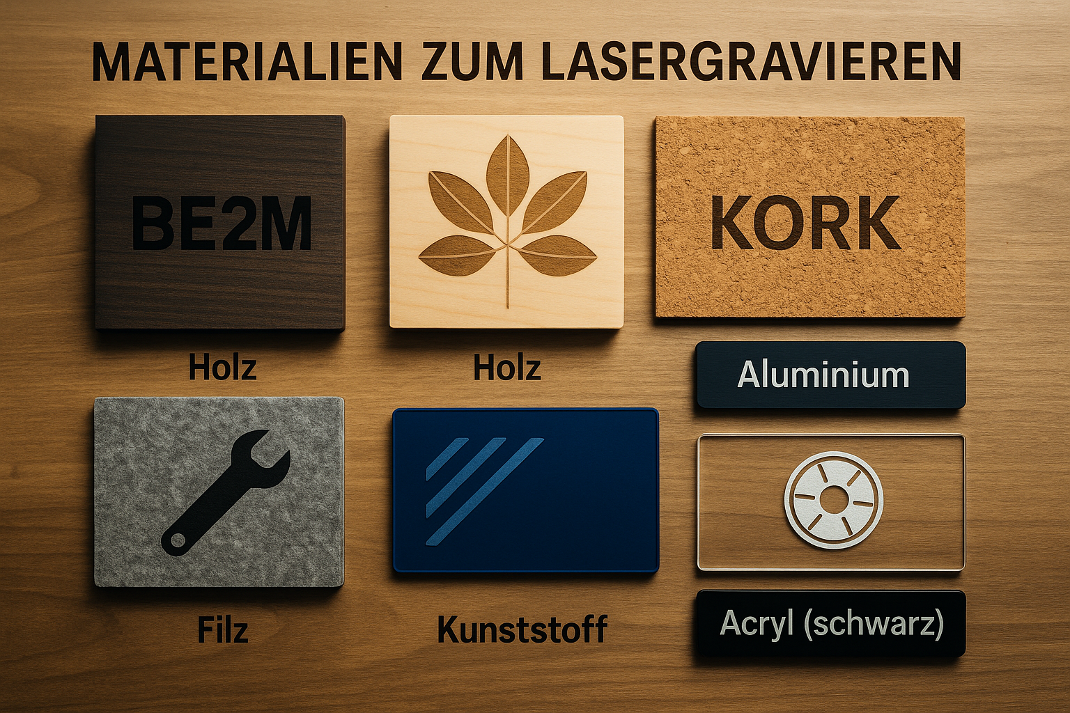 Die Lasergravur eignet sich für eine Vielzahl nichtmetallischer Werkstoffe. Die Auswahl erfolgt anhand Oberfläche, Struktur und gewünschtem Gravurbild.